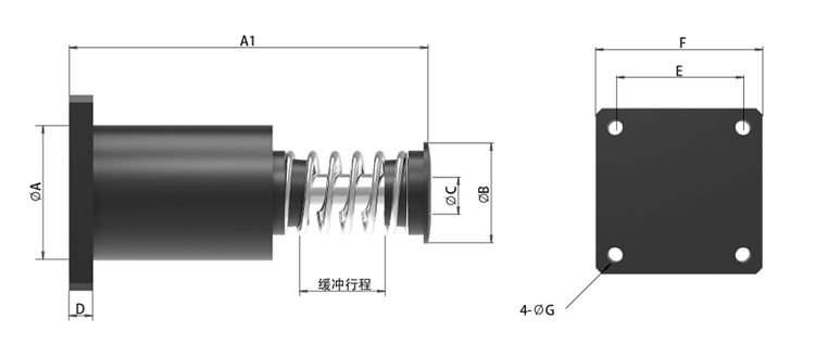 安裝要求:緩沖行程在300mm以內(nèi),較大允許側(cè)負荷角度為2.5°;緩沖行程為300mm以上,較大允許側(cè)負荷角度為1°;確保螺栓螺母鎖緊牢固,建議使用螺紋膠。